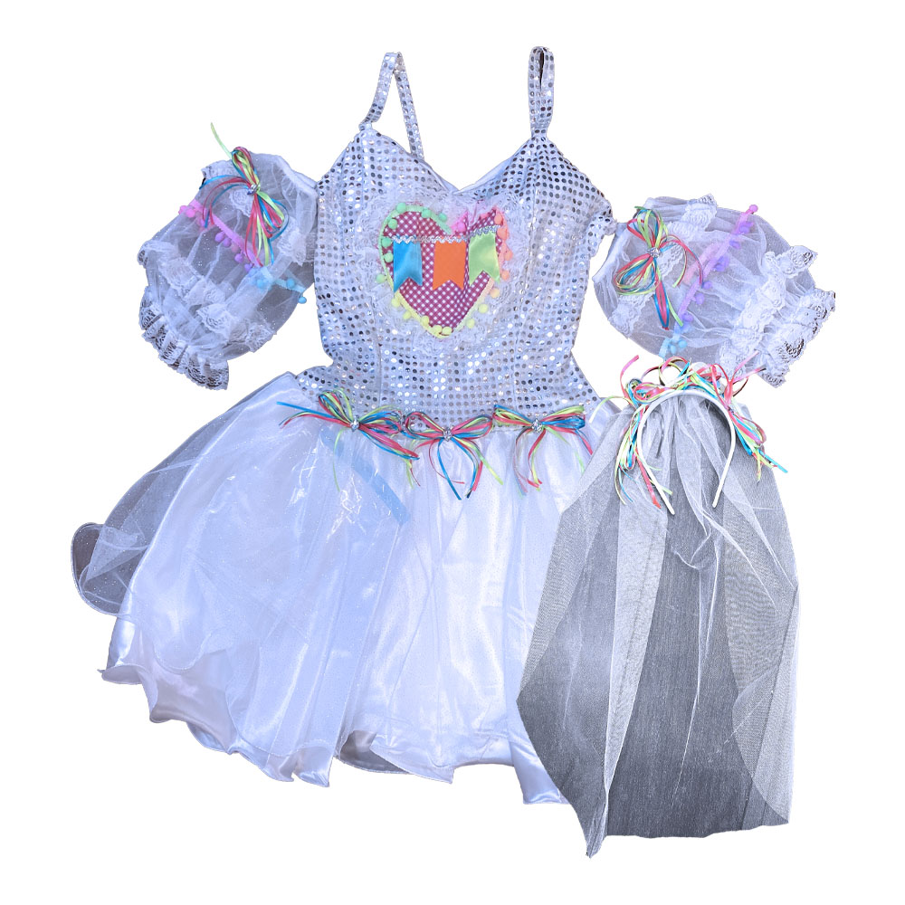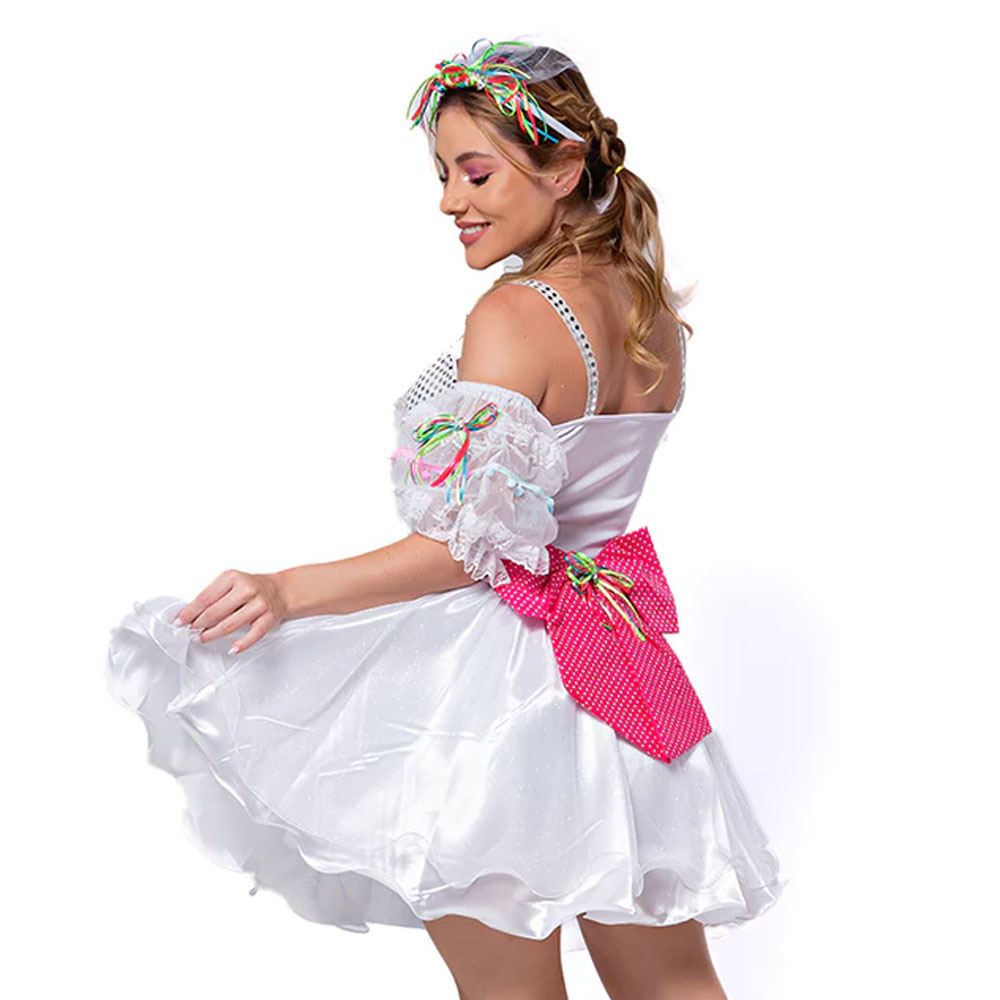 Vestido junino de noiva linha luxo com alcinhas e corpo em paetê, coração de renda e passamanaria de pompom multicolorido com bandeirolas em fita de cetim. Mangas soltas em tecido transparente com renda e pompons. Sobressaia com glitter e forro de cetim. Acompanha uma tiara branca com fitas coloridas e véu branco com glitter.