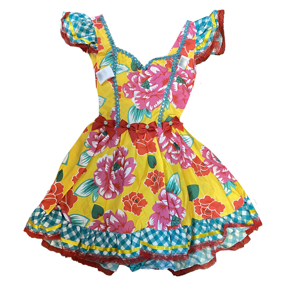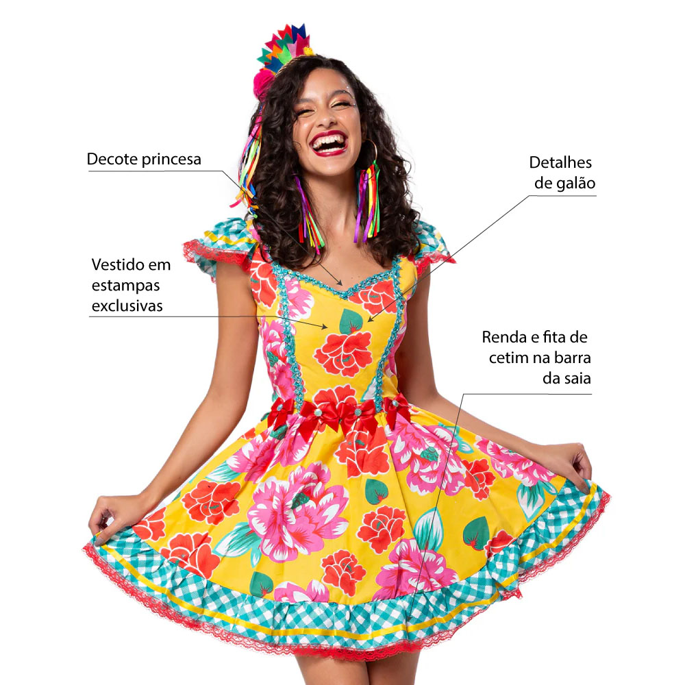 O vestido junino adulto linha luxo possui estampas exclusivas, decote princesa e detalhes de galão no corpo. Saia rodada com babado contrastante, lacinhos na cintura com miolo de pedra e barra com renda e fita de cetim. Acompanha calçola (shorts).